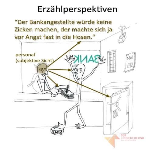 Im Bankraub-Beispiel würde eine personale Erzählperspektive bedeuten, dass bspw. aus Sicht des Bankräubers erzählt wird. Der ist in seiner Wahrnehmung auf seine Sinne beschränkt - er kann also nicht sehen, dass der Bankangestellte gleich den Alarmknopf drücken wird.
