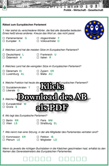 Arbeitsblatt: Rätsel zum Europäischen Parlament (Vorschaubild, Klick zum Download als PDF)Die Aufgaben sind recht einfach bzw. einfach recherchierbar (Niveau “grün”), da sie v.a. (Allgemein-)Wissen abfragen; auf Niveau “rot” wird an dieser Stelle ein Vergleich des deutschen Bundestages und des EU-Parlaments vorgenommen.