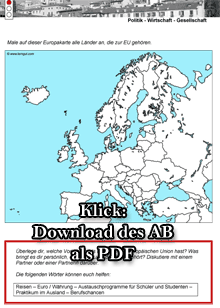 Arbeitsblatt: Welche Länder gehören zur EU? (Vorschaubild, zum PDF-Download klicken)Der Arbeitsauftrag zur Karte lautet: “Male auf dieser Europakarte alle Länder an, die zur EU gehören.” Je nach verfügbarer Unterrichtszeit können die Schüler/innen die Länder mit unterschiedlichen Farben ausmalen; für fortgeschrittenere Klassen könnten die verschiedenen Erweiterungsphasen mit jeweils einer Farbe markiert werden (Gründungsmitglieder, Osterweiterung(en)).