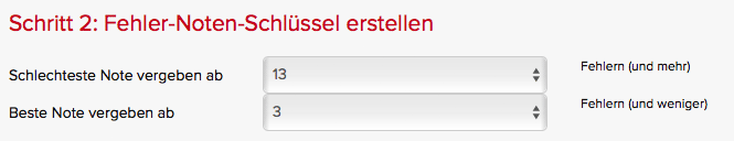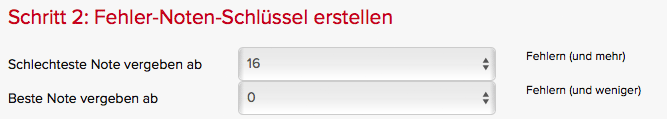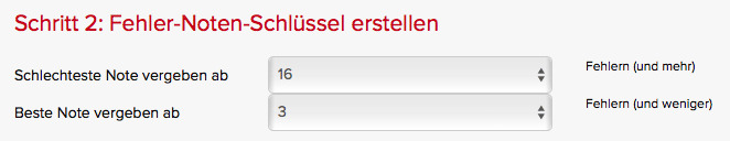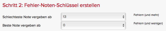 Dann definieren Sie den Fehler-Noten-Schlüssel:  Sie legen (ebenfalls wie bei den anderen Notenschlüsselrechnern) fest, ab wie vielen Fehlern Sie die schlechteste und die beste Note vergeben. Dies erlaubt Ihnen den Einbau von Sockeln (siehe unten).