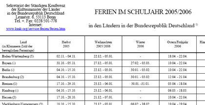 Die verbindlichste und übersichtlichste Übersicht über die Schulferien der Bundesländer findet sich bei kmk.org/service/ferien/ferien.htm. Die Ferientermine aller Bundesländer sind für jedes Schuljahr in einer eigenen pdf-Datei abrufbar. Außerdem eine Übersicht für die Schuljahre 1952/53 bis 2003/04 und eine Übersicht über alle gesetzlichen Feiertage bis 2010 (pdf).