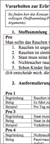 Übung: Zum Üben bietet sich das Arbeitsblatt »Freie Erörterung - Thema Rauchen« (pdf) an. Thema der Erörterung ist »Sollte man das Rauchen verbieten?«