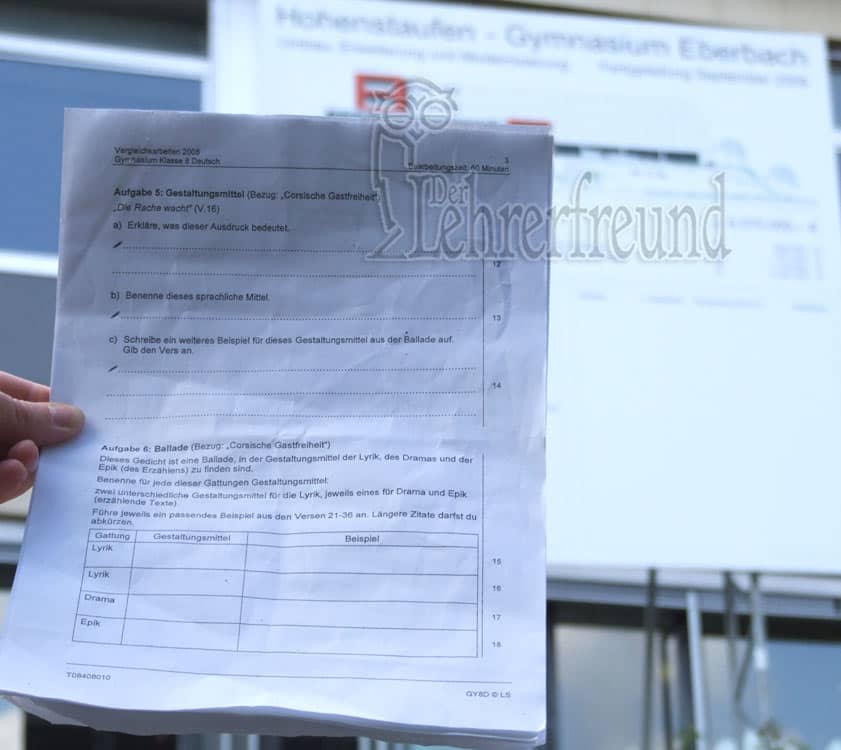 In Baden-Württemberg mussten die Vergleichsarbeiten für Deutsch+Geschichte (Gymnasium) abgeblasen werden - schon vor Termin waren die Klausurbögen in Umlauf geraten. Das Kultusministerium ist noch verwirrt; der Journalist Christofer Menges aber hatte die Klausurbögen schon eine Woche vor dem geplanten Termin. Hier alle Einzelheiten und Hintergründe, teilweise in Gedichtform, mit exklusivem Fotomaterial. Außerdem ein Kommentar von Lehrerfreund-Chefredakteur Berthold Metz.