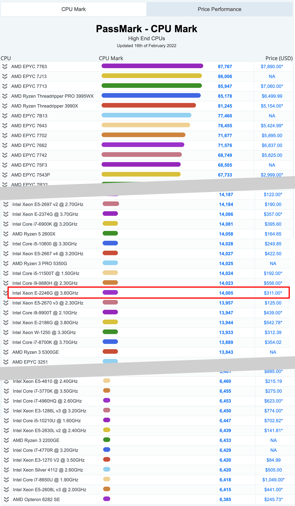 Robhost ist inzwischen dogado.pro, und dort mieten wir einen Xeon E-2246G mit sechs Kernen zu je 3,60 GHz (bei cpubenchmark.net, Screenshot). Der sitzt auf einem Supermicro MicroCloud, und da sitzen noch 64GB DDR4 ECC RAM und 2x1024GB NVMe SSDs.
