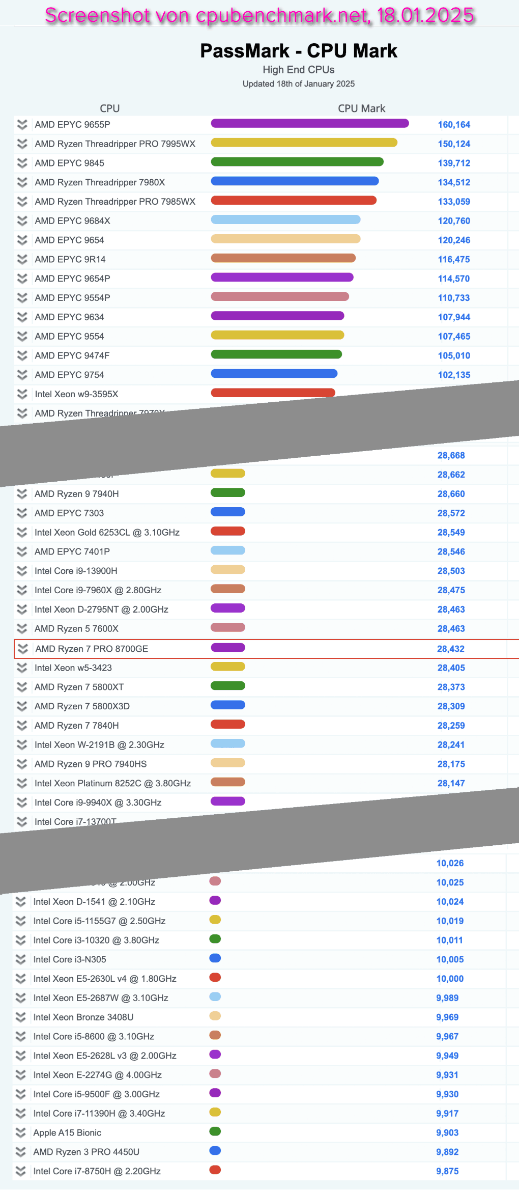 Ein Server-Upgrade, wieder bei dogado.pro: ein AMD Ryzen 7 PRO 8700GE mit acht Kernen a 3,6 GHz (bei cpubenchmark.net, Screenshot) und 64GB DDR5 RAM und 2x512GB NVMe SSD.