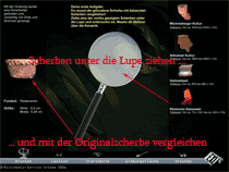 Das Material ist didaktisch größtenteils außerordentlich gut aufbereitet. Es erlaubt einerseits eine vollkommen selbstständige Beschäftigung mit der CD, andererseits müssen die Inhalte verstanden und angewendet werden können, um weitere Kapitel freizuschalten. Die Überprüfungen erfolgen im Multiple-Choice-Modus, fragen aber dennoch nicht nur bloßes Wissen ab. So werden z.B. Keramikscherben aus verschiedenen Epochen vorgestellt, die SchülerInnen müssen danach Merkmale zuordnen und eine Entscheidung treffen, welcher Epoche die tatsächlich gefundenen Scherben zuzuordnen sein könnten (s.u. Bild).
