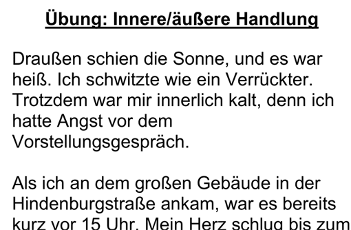 Sie finden hier eine Folie mit einem kurzen Text; außerdem den gleichen Text als Kopiervorlage zum Zerschneiden und Austeilen. Die Schüler/innen sollen markieren, was innerer und was äußerer Handlung zuzuordnen ist. Beispiel: