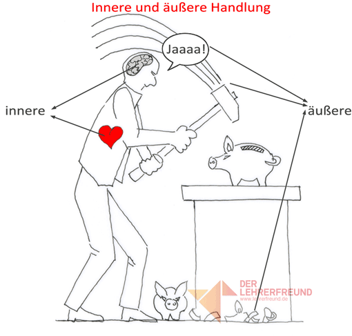 Die Thematik wird so offensichtlich: Unter "äußere Handlung" fassen wir Geschehnisse, die beobachtbar bzw. sinnlich wahrnehmbar sind (z.B. Hammer zerschlägt Schwein, Scherben liegen herum, Mann schreit "Jaaa!"). Die "innere Handlung" dagegen bezeichnet Vorgänge, die sich im Bewusstsein der Protagonist/innen abspielen (Gefühle, Gedanken etc. - z.B. Mann freut sich auf das Geld im Schwein, Mann denkt, dass er bald einen größeren Hammer kaufen muss).