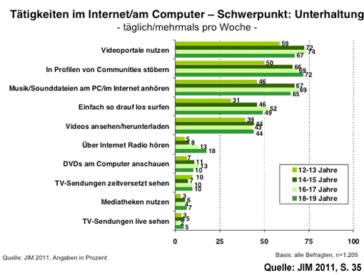 Die JIM-Studie 2011 unterscheidet verschiedene Schwerpunkte der Internetnutzung. Vergleicht man die Bereiche "Unterhaltung" (S. 35) und "Web 2.0" (S. 38), fällt auf, dass die Jugend von heute zwar eine Menge konsumiert, selbst aber kaum gezielt Daten erzeugen. Alle Tätigkeiten, die eine aktive, kreierende Beschäftigung mit Inhalten erfordern, sind in den Bereichen deutlich unter 20% angesiedelt. Wesentlich häufiger sind vorwiegend passive Tätigkeiten (Videoportale, in Profilen stöbern, Musik hören,  "einfach drauf los surfen" ... ) zu finden.