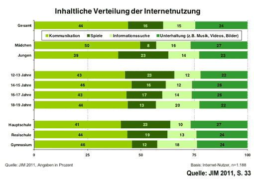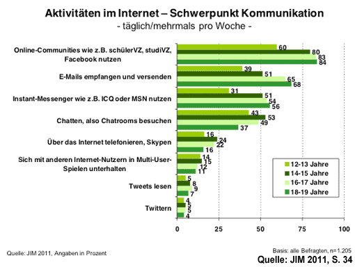 44% der online verbrachten Zeit wird für "Kommunikation" genutzt, 24% für "Unterhaltung" und 16% für "Spiele" (S. 33). An erster Stelle liegt die Nutzung von Sozialen Netzwerken (Facebook, schülerVZ ...), gefolgt von E-Mail, Instant Messaging, Chat und Skype. Twittern ist unter Jugendlichen kaum verbreitet.