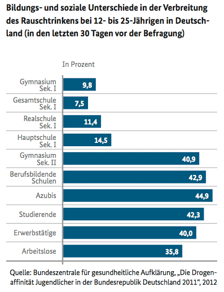 Im Jahr 2011 betrieben 15,2 Prozent der 12- bis 17-jährigen Jugendlichen in den letzten 30 Tagen vor der Befragung Rauschtrinken; 2004 waren es dagegen 22,6 Prozent.