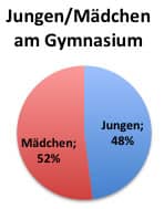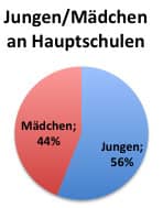 Demnach lag der Mädchenanteil im Schuljahr 2007/2008 an Hauptschulen bei 44%, an Gymnasien jedoch bei 56%. An den Realschulen ist die Verteilung etwa gleich. An Förderschulen liegen die Jungen mit 63% noch deutlicher in der Mehrheit. Entsprechend unterschiedlich fallen die Quoten hinsichtlich der Schulabschlüsse aus.