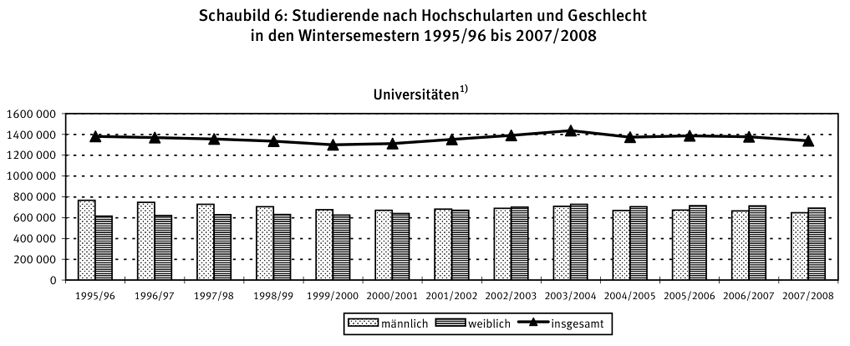 Das ist nicht weiter verwunderlich: Jungen stellen die Mehrheit der Hauptschulabgänger/innen dar und werden einen entsprechenden Berufsweg ergreifen. An den Universitäten dagegen liegen die Mädchen deutlich vorne. Erstaunlich ist allerdings, dass Mädchen erst seit dem Wintersemester 2002/2003 die Mehrzahl der Studierenden an Universitäten stellen. In den Jahren zuvor waren es deutlich die Jungen. Also präzisieren wir: Jungen sind die Verlierer/innen des Bildungssystems. Das gilt aber nur für die letzten sieben Jahre.