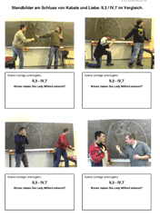 Auf den vier Standbildern ist jeweils der Schluss einer der beiden Szenen abgebildet. Die SchülerInnen sollen sich mit den Standbildern auseinandersetzen - welche Szene ist umgesetzt (Szene auf dem Arbeitsblatt markieren)? Woran wurde Lady Milford bzw. ihr Gegenüber erkannt (Stichworte)?