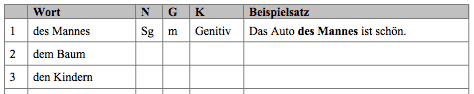 Eine einfache Übung für die Sekundarstufe I oder berufliche Schulen: Die SchülerInnen müssen Kasus (Fall: Nominativ, Genitiv, Dativ, Akkusativ), Numerus (Zahl: Singular, Plural) und Genus (Geschlecht: männlich/maskulin, weiblich/feminin) einzelner deklinierter Substantive bestimmen und jeweils einen Beispielsatz generieren, in dem das Wort vorkommt.