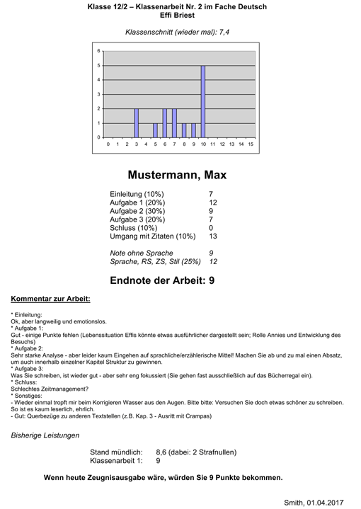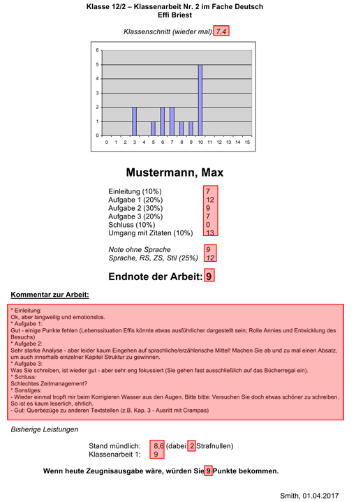 Wird mit jeder Klassenarbeit ein solcher Bogen ausgegeben, entsteht bezüglich der Notensituation eine sehr hohe Transparenz, die Missverständnisse völlig ausschließt. Die Diskussion um eine schlechte mündliche Note erfolgt während des Schujahrs; kurz vor der Zeugnisausgabe muss nicht mehr gestritten werden. Fragen wie “Wie stehe ich mündlich?” oder “Wie viele Plus habe ich?” gehören der Vergangenheit an.