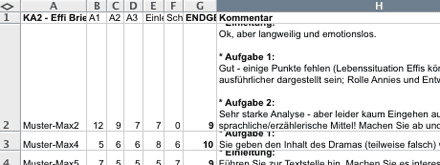 Mündliche Noten, alte Klassenarbeiten usw. liegen bereits in der Excel-Tabelle vor. Korrigieren Sie die aktuelle Klassenarbeit (wie hier beschrieben). Eine zusätzliche Spalte benutzen Sie für die Kommentare. Das ist nicht besonders komfortabel und etwas unübersichtlich (z.B. Zeilenumbrüche mit alt + Eingabe), die Möglichkeit der einfachen Korrektur eigener Fehler und Weiterverarbeitung wiegt dieses Manko jedoch auf.