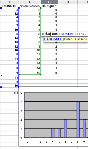 Auf diesem Blatt wurden alle (Teil-)Noten, der Notenschnitt der Klassenarbeit, der Kommentar zur Klassenarbeit, die bisherigen Leistungen und der aktuelle Leistungsstand automatisch über die Seriendruckfunktion (“Serienbrief”) eingefügt. Das Diagramm mit der Häufigkeitsverteilung der Noten im Klassenverband wurde in Excel erstellt (Funktion “Häufigkeit”) und manuell in das Vorlagendokument eingefügt (Screenshot). Die Anzahl der “Strafnullen” wurde über die Funktion =ZÄHLENWENN(B3:V3;0) ermittelt und ebenfalls automatisch eingefügt, wobei B3 bis V3 der zu untersuchende Zellraum ist (=alle mündliche Noten) und der Parameter “0” das zu zählende Kriterium.