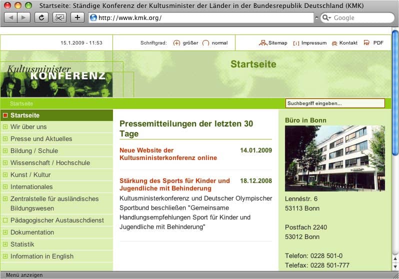 Nun hat die Kultusministerkonferenz seit 2009 also eine neue Website. Eine ausführliche, sehr detaillierte und zutreffende Besprechung der Website findet man bei reticon (Endlich: Kultusministerkonferenz mit neuem Webauftritt). Fazit dieser Darstellung: Kleinere, teils schmerzhafte Mängel, insgesamt aber ordentlich gelungen.