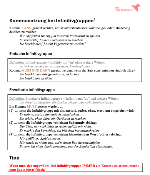 Das folgende Arbeitsblatt realisiert §75 (Kommasetzung bei Infinitivgruppen) des amtlichen Regelwerks der deutschen Rechtschreibung (Link zum Volltext der amtlichen Version 2018/2024, Kapitel 2.1 Komma). §77 wird nicht berücksichtigt, da diese Fälle größtenteils durch §75(1) abgedeckt sind. Aus didaktischen Gründen ist es ratsam, sich nicht am Regelwerk zu orientieren, sondern die Regeln getrennt nach einfachen und nach erweiterten Infinitivgruppen zu betrachten.