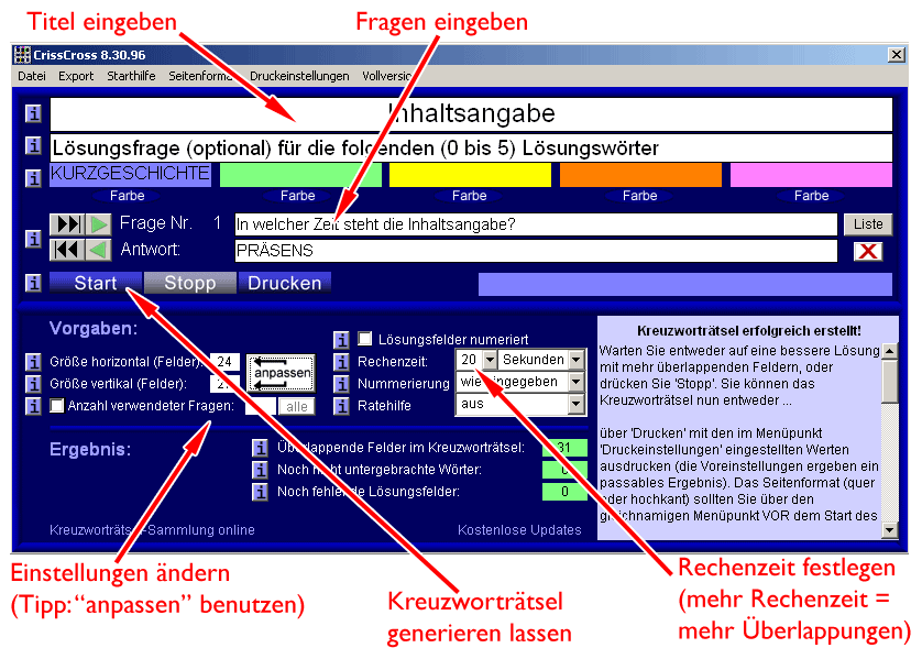 kreuzworträtsel - BeispielDer Kreuzworträtselgenerator “Criss Cross” ermöglicht es, in wenigen Minuten ein eigenes Kreuzworträtsel für den Unterricht zu erstellen. Das Programm bedient sich einfach und nett. Für ein Kreuzworträtsel mit 20 Fragen braucht man - je nach Tippgeschwindigkeit - höchstens 10 Minuten.