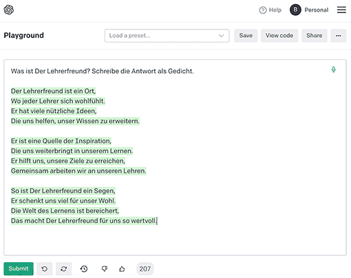 Beachten Sie, dass die Texte jeweils unterschiedlich sind. Es lassen sich jedoch auch Einstellungen treffen ("temperature"), mit denen die Variabilität der Texte verringert wird. Anders formuliert: Bei temperature 0 geben alle Schüler/innen genau die gleichen Hausaufgaben ab. Siehe unten, Abschnitt »Variabilität«