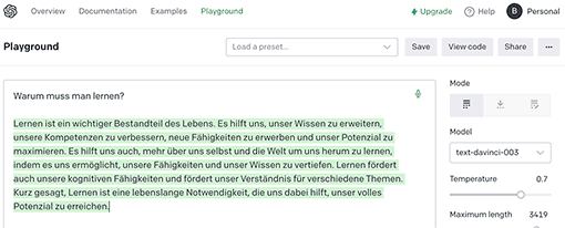 Das ist denkbar einfach. Sie registrieren sich kostenlos bei OpenAI. Dann klicken Sie auf den Link "Playground" und sagen der KI (Künstliche Intelligenz), was Sie von ihr wollen.