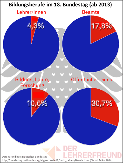 Der Deutsche Bundestag veröffentlicht zu Beginn jeder Wahlperiode eine Statistik über die Berufe der Abgeordneten. Denken wir darüber nach, wie viele Lehrer/innen, Beamt/innen und Bildungspersonen die Interessen des Bildungswesens vertreten. Daten des 18. Bundestags seit 2013.