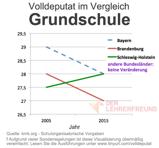 Neben dem marginalen Anstieg in Schleswig-Holstein und der Absenkung von 28 auf 27 Stunden in Brandenburg sind die Volldeputate an Grundschulen in den anderen Bundesländern zwischen 2005 und 2015 gleich geblieben.