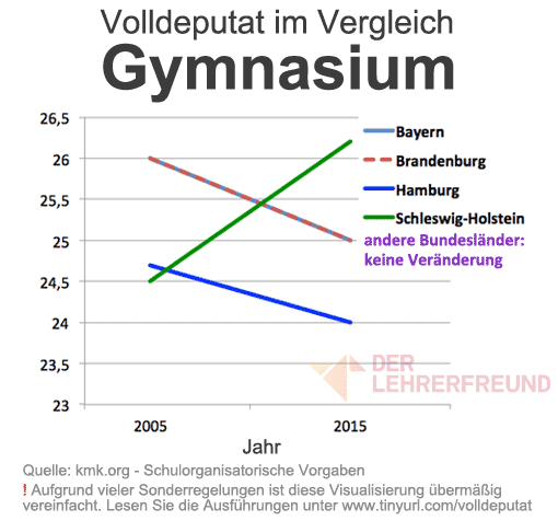 In Schleswig-Holstein wurde das Deputat von 24 Stunden im Schuljahr 2005/2006 auf 25,5 bzw. auf 27 (falls kein Oberstufenunterricht) angehoben (im Diagramm wird der Mittelwert verwendet). In Niedersachsen wurde das Deputat um eine Stunde angehoben; diese Erhöhung musste wieder rückggängig gemacht werden (Urteilsspruch des Obverwaltungsgerichts Lüneburg (2015) - vielen Dank für den Hinweis an @ixsi!). Ergänzung 03/2018: Unsere Leserin M.G. weist uns darauf hin, dass an Berufsbildenden Schulen in Niedersachsen im gehobenen Dienst 27,5 Stunden unterrichtet werden müssen (Quelle PDF).