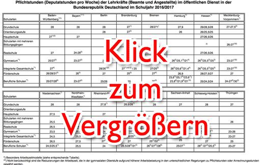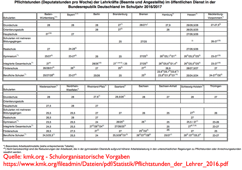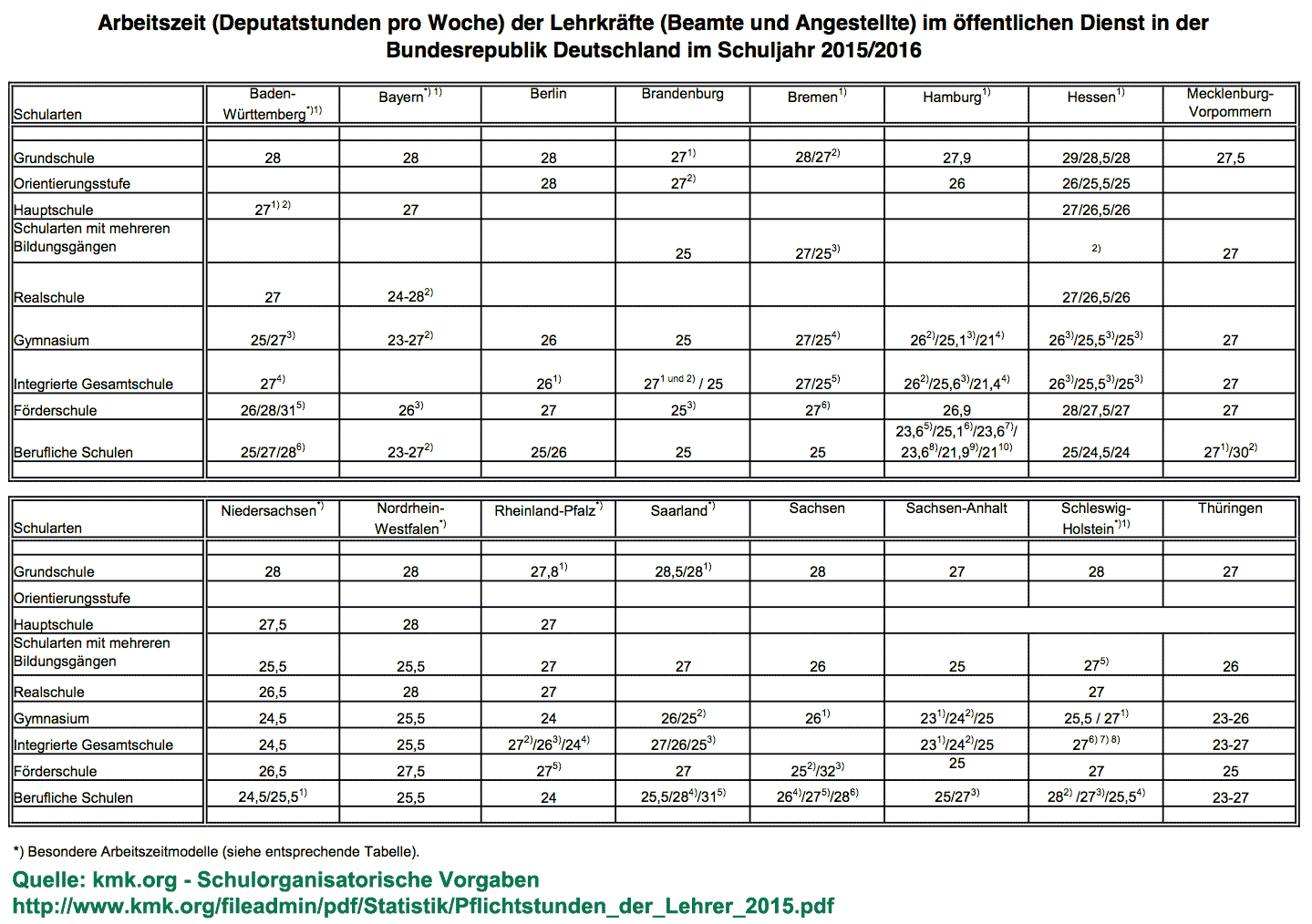 Die folgende Tabelle ist der KMK-Veröffentlichung Übersicht über die Pflichtstunden der Lehrkräfte an allgemeinbildenden und beruflichen Schulen, Schuljahr 2016/2017 (PDF) entnommen - Klick aufs Bild zum Vergrößern (öffnet in neuem Fenster).