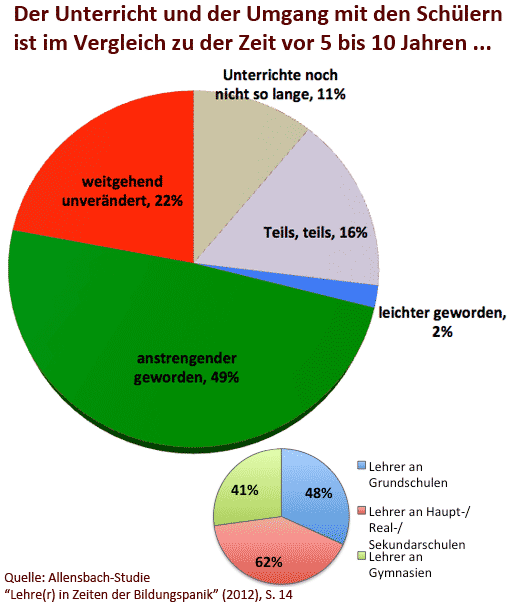 Gleichzeitig sehen sich große Teile der Lehrerschaft aber zunehmenden Belastungen ausgesetzt. Fast jeder zweite Lehrer ist der Ansicht, dass der Unterricht und der Umgang mit den Schülern in den letzten Jahren anstrengender geworden sind. Die Lehrer verweisen vor allem auf die nachlassende Disziplin und Konzentrationsfähigkeit der Schüler. [...]
