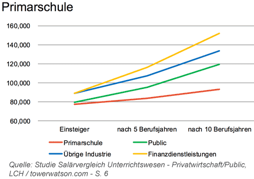 Im folgenden Diagramm ist deutlich zu erkennen, dass in der Primarschule (Grundschule) das Einstiegsgehalt deutlich unter den Gehältern der anderen verglichenen Beschäftigungsfelder liegt. Ebenso ist zu sehen, dass sich der Anstieg über die ersten 10 Berufsjahre wesentlich flacher gestaltet: