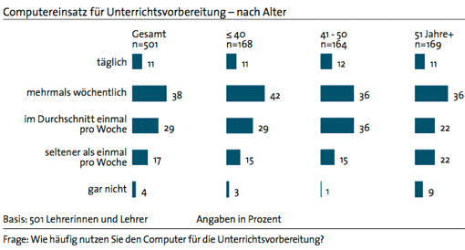Da fliegt einem schon das erste Mal das Blech weg: 21% aller Lehrer/innen nutzen den Computer zur Unterrichtsvorbereitung seltener als einmal die Woche; bei den unter 40-Jährigen sind es noch 18%.