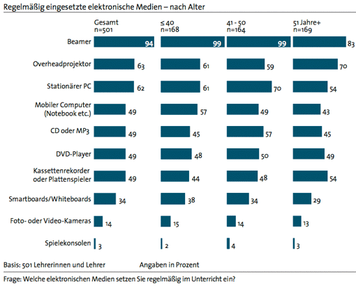 Bei der Frage nach den "regelmäßig eingesetzten elektronischen Medien" geben 94% aller Befragten an, "regelmäßig" mit Beamer zu arbeiten; 62% arbeiten im Unterricht "regelmäßig" mit einem stationären PC (S. 16):