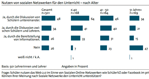 Die jüngere Gruppe ist der Nutzung von sozialen Netzwerken gegenüber sehr positiv eingestellt, während knapp die Hälfte der Gruppe 51 Jahre+ keinen Vorteil darin sieht. Allerdings sieht man bei der Frage nach den Einsatzzwecken, dass nur 11% soziale Netzwerke im Unterricht nutzen.