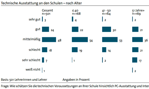 Überraschend ist, dass die älteren Lehrer die Lage deutlich schlechter einschätzen als die Jüngeren, obwohl sie die digitalen Medien seltener nutzen. So sagen 38 Prozent der Lehrer über 50 Jahre, dass die technische Ausstattung ihrer Schule schlecht bis sehr schlecht sei. Dies behaupten hingegen nur halb so viele Lehrer unter 40 Jahren (20 Prozent). Vermutlich fließt hier die persönliche Einstellung und das Zurechtkommen mit den digitalen Medien wesentlich in die Beurteilung mit ein.