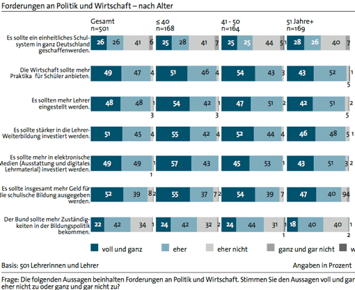 Ebenso viele (96 Prozent) fordern, dass mehr Lehrer eingestellt werden sollten und dass stärker in die Lehrer- Weiterbildung investiert werden sollte.