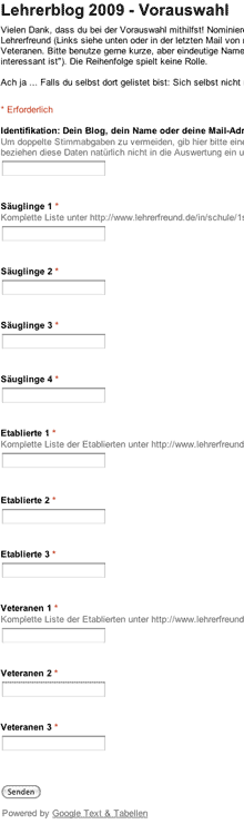 Insgesamt haben 20 Expert/innen (teilweise aus den Listen Säuglinge, Etablierte und Veteranen) ihre persönliche Top 10 gewählt (Screenshot vom Formular siehe rechts). Die daraus ermittelten zehn Anwärter/innen zum Lehrer/innen-Blog 2009 werden in den nächsten Tagen zur öffentlichen Abstimmung gestellt.