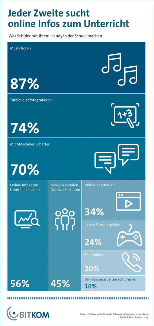 Schüler/innen und ihr Smartphone - Der Branchenverband BITKOM veröffentlichte das Ergebnis einer eigenen Studie: Was machen Schüler/innen in der Schule mit ihren Smartphones? 74 Prozent der Schüler/innen würden demnach mit ihrem Smartphone Tafelbilder abfotografieren, 56% online "Infos zum Lehrinhalt suchen" und 10% bei Klassenarbeiten schummeln. Und nur 34% schauen Videos an. Möglicherweise haben die anderen keinen Internetzugang. Jugendliche, die auf ihrem Smartphone nicht Videos anschauen, wirken irgendwie … abartig.
