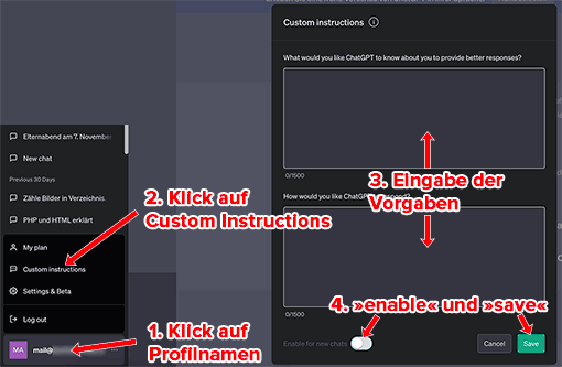 Über Custom Instructions können Sie ihm dieses zeitraubende Verhalten abdrehen. Schreiben Sie bspw. in den Bereich »Antwort«: