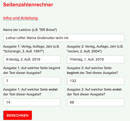 Damit das funktioniert, müssten Sie nach Möglichkeit die Felder des Seitenzahlenrechners möglichst präzise ausfüllen, also etwa so: