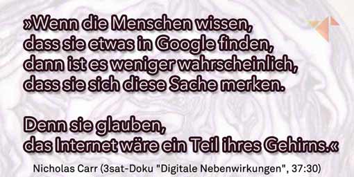 »Wenn die Menschen wissen, dass sie etwas bei Google finden, dann ist es weniger wahrscheinlich, dass sie sich diese Sache merken. Denn sie glauben, das Internet wäre ein Teil ihres Gehirns.« (Nicholas Carr)