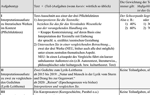 2014 änderten sich im Deutschabitur Baden-Württemberg nicht nur die Pflichtlektüren; auch die Aufgabentypen wurden vollständig umgearbeitet. Ab 2019 gibt es weitere Anpassungen. Ein Überblick (allgemeinbildende Gymnasien) und Kommentar von Db (JKG Bruchsal).