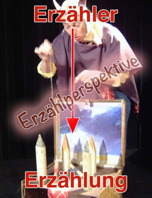 Erzählperspektiven sind ein wesentlicher Baustein der Interpretation fiktionaler Texte. Sie finden hier ein Bild (z.B. für Folie oder Arbeitsblatt), das die auktoriale Erzählperspektive und ihre Eigenschaften klar veranschaulicht: ein Schauspieler, der aus der Handlung heraustritt und diese als Marionettentheater fortführt und kommentiert.