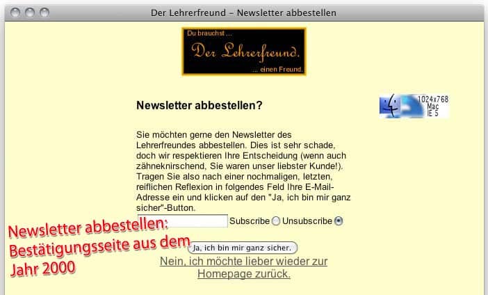 Abmeldeseite des Lehrerfreund-Newsletters im Jahr 2000