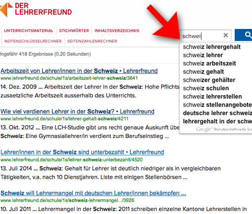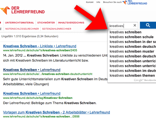 Endlich haben wir die Lehrerfreund-Suche perfektioniert. Noch während der Eingabe eines Suchbegriffs erhalten Sie Vorschläge, was zu suchen sich lohnen könnte. Das sieht dann z.B. so aus (Klick aufs Bild für diese Suchenanfrage):