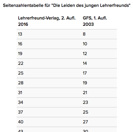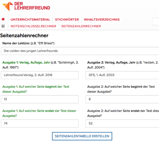 Mit dem Lehrerfreund-Seitenzahlen-Rechner können Sie einfach die Seitenzahlen unterschiedlicher Ausgaben (oder Auflagen) einer Lektüre online umrechnen und als Tabelle ausgeben lassen.