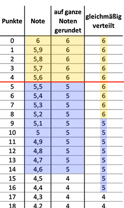 Wenn Sie einen Notenschlüssel über 50 Verrechnungspunkte als ganze Noten ausgeben lassen, wird die 6 nur halb so oft vergeben wie die 5 (folgendes Bild, dritte Spalte). Sie erwarten aber eine gleichmäßige Verteilung der Noten über die gesamte Verrechnungspunktspanne, also ein Ergebnis wie in der vierten Spalte: