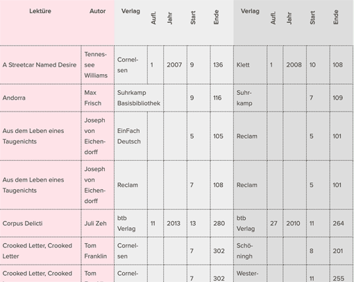 Ausschnitt: Tabelle mit Seitenzahlen verschiedener Lektüre-Ausgaben